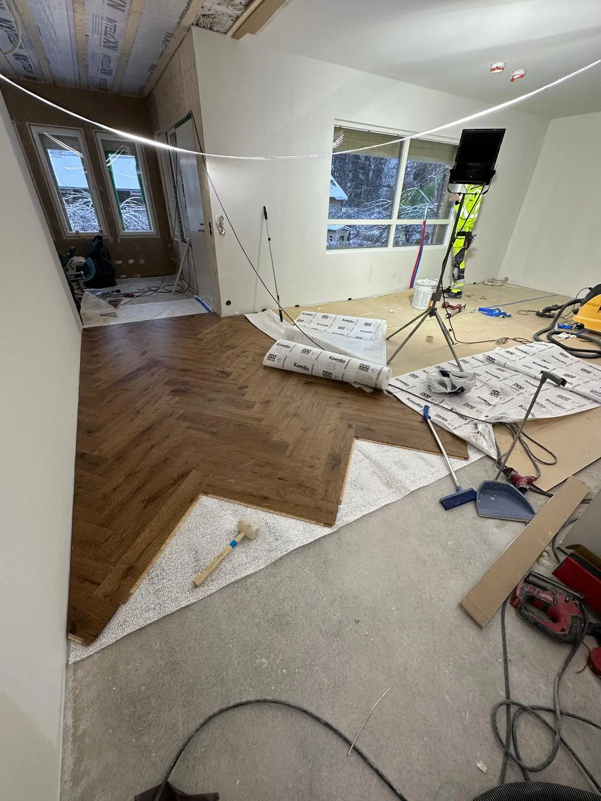 Kuvassa (alla) näkyy yksi Ratkasu Oy:n toteuttama kalanruotoparketin asennus Espoon Westendissä, 50 m²:n kokoiseen olohuoneeseen.